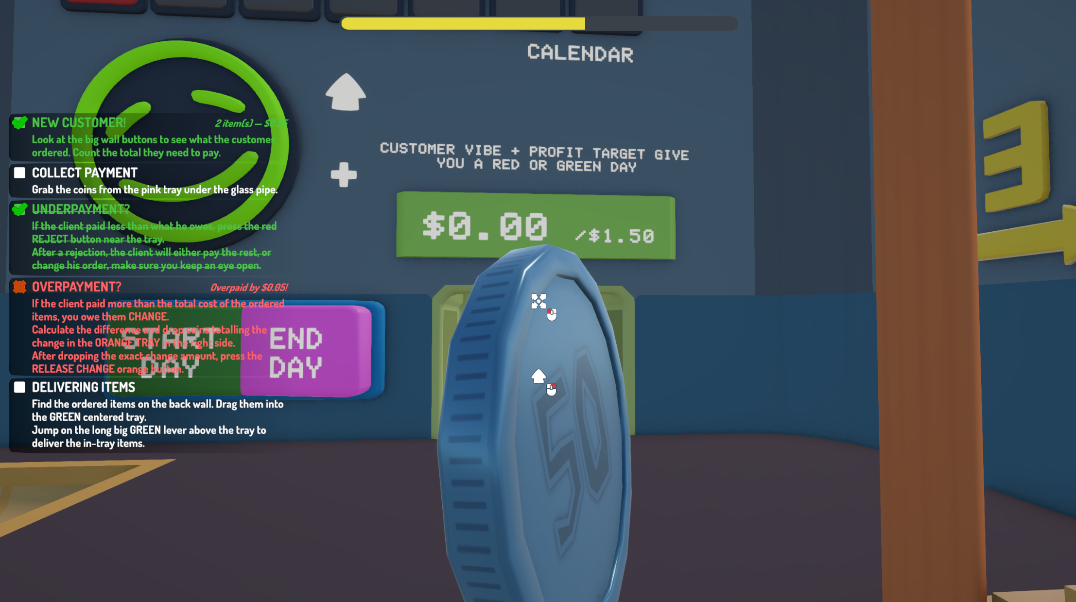 The Calendar: Each day is scored based on how well you served customers and how much profit you made. The calendar on the right wall tracks your performance — red means bad, orange means decent, green means great.