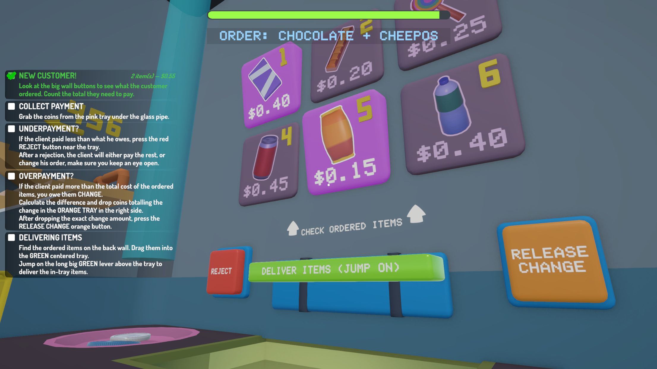 Customers arrive with orders and drop coins through the pipe. Your job is to count their payment, deliver the right items, and return correct change — all while managing the chaos of a physics-based vending machine interior.